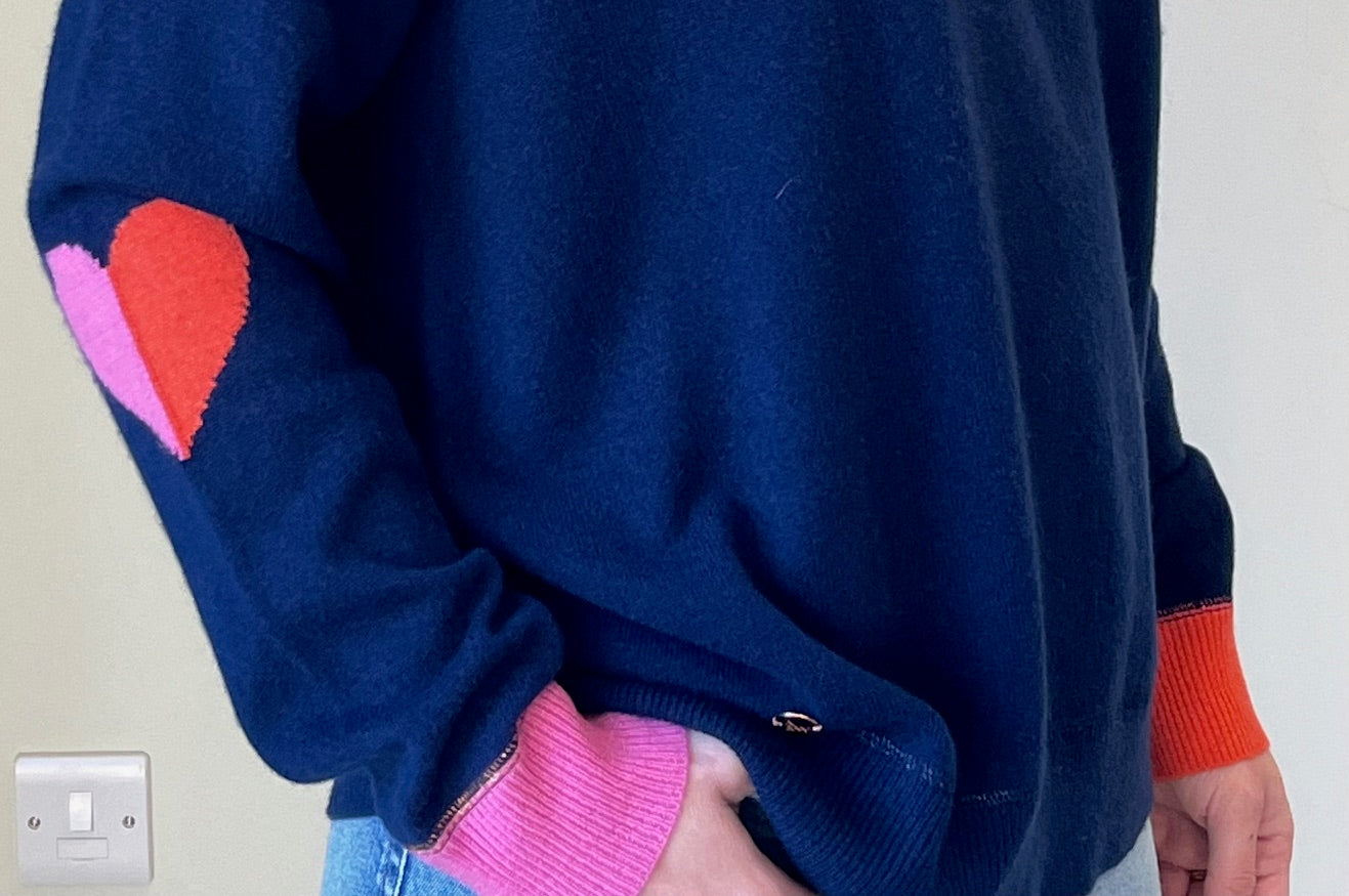 Featuring charming intarsia knit pink & orange hearts on the elbows and contrast cuffs, this relaxed-fit sweater drapes effortlessly for a versatile look. Crafted from our luxurious, sustainable cashmere yarn, it boasts our signature details: delicate lurex stitching and subtle copper A&W branding.