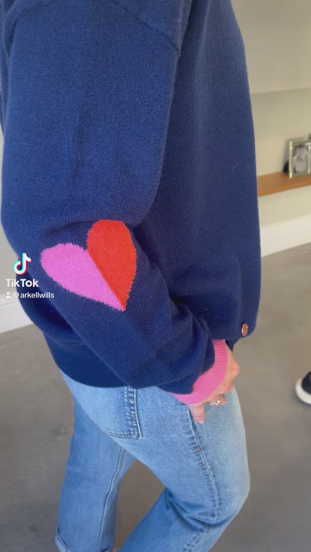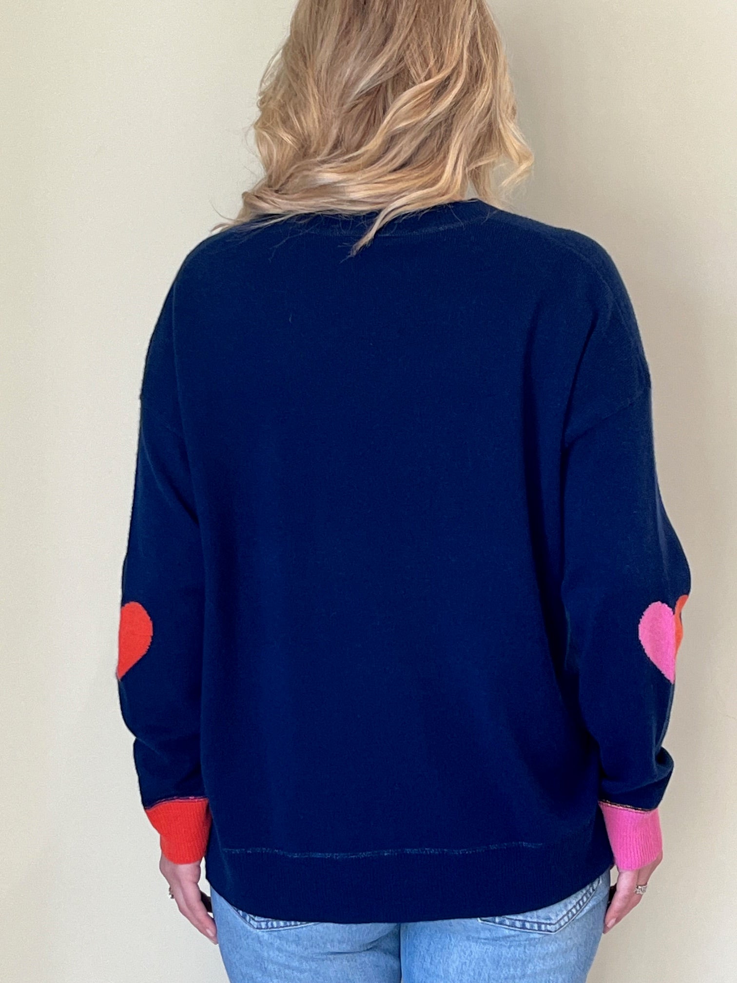 Classic navy boyfriend v-neck sweater with heart intarsia elbows