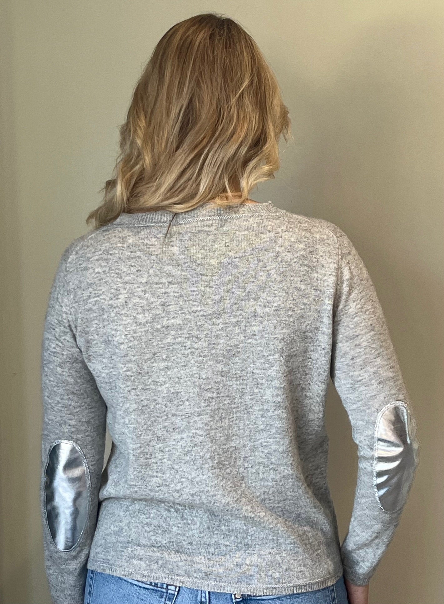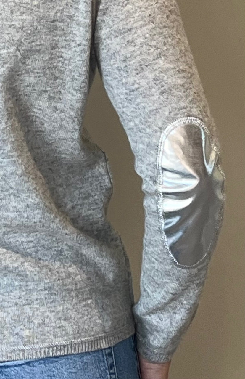Grey boxy crew neck with silver faux leather elbow patches
