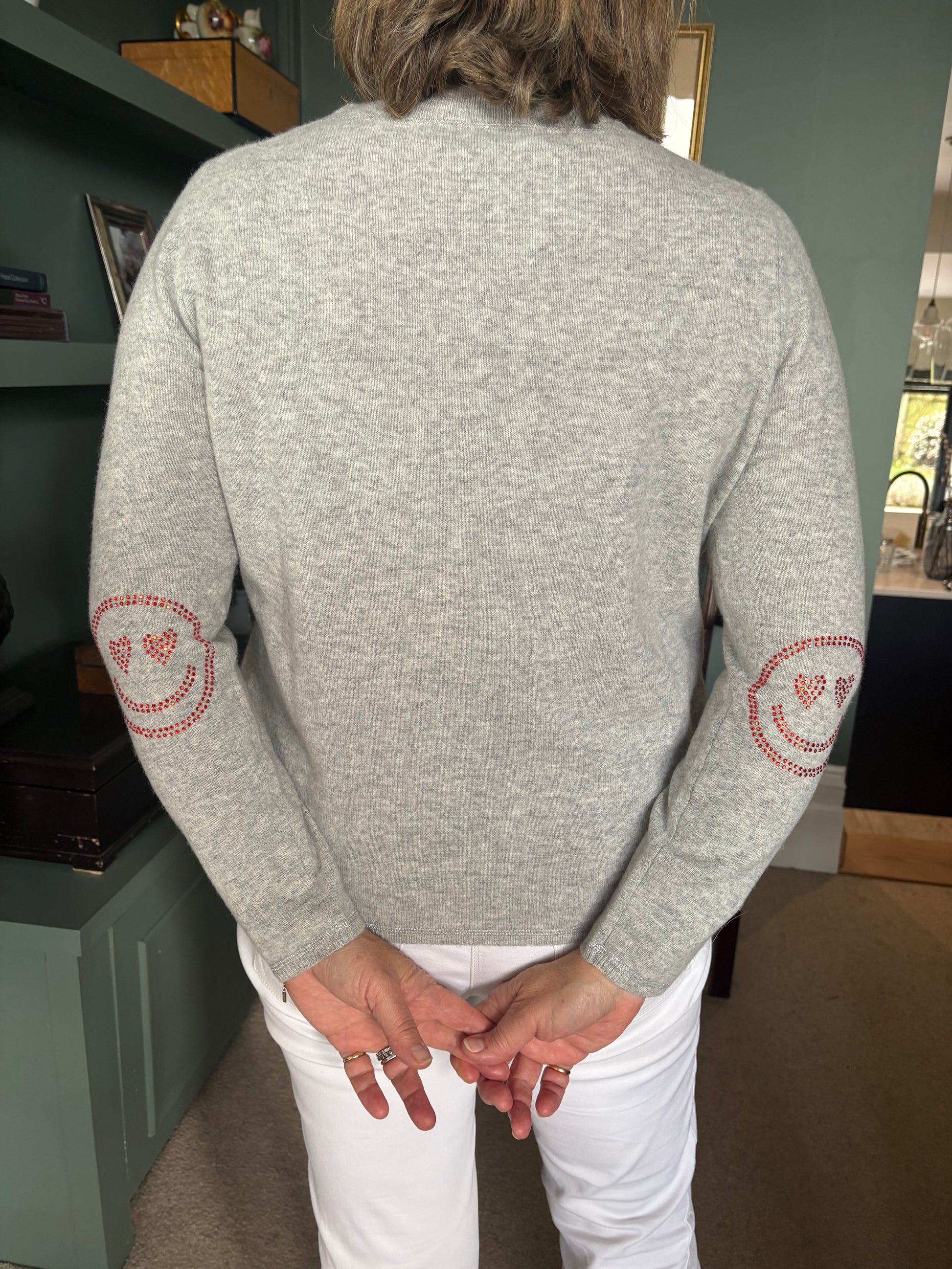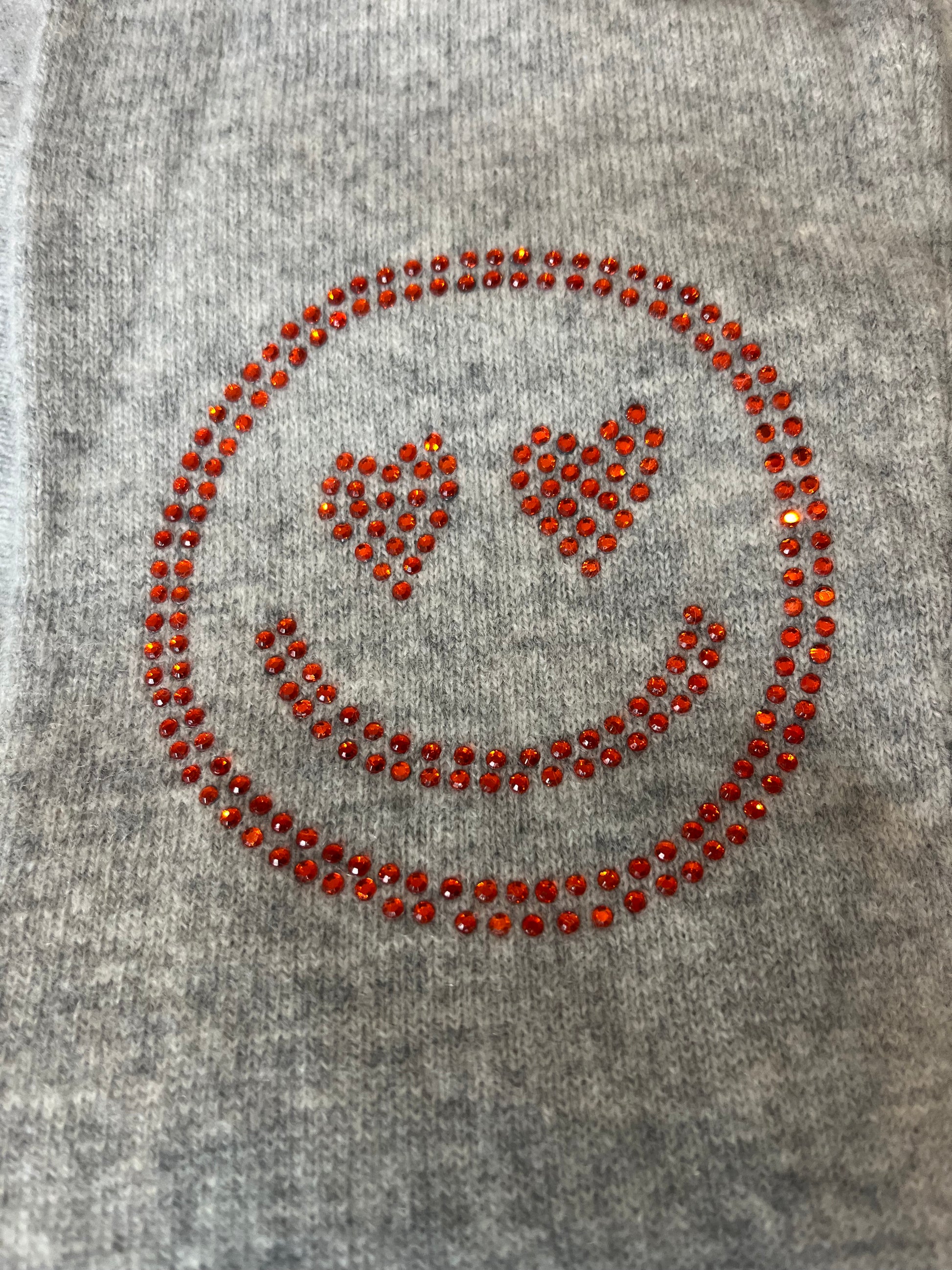 Discover the pinnacle of luxury with our renowned grey boxy crew neck sweater, adorned with vibrant orange diamante smiley face elbow patches, enough to make everyone smile!