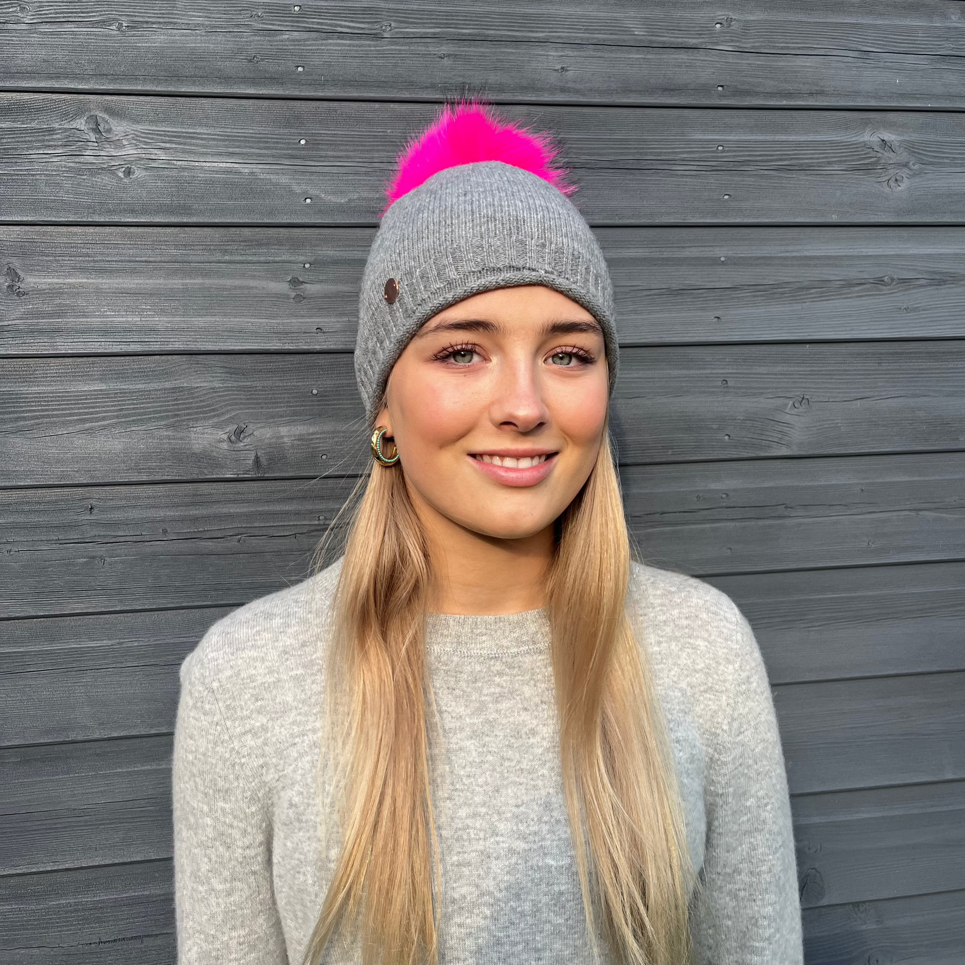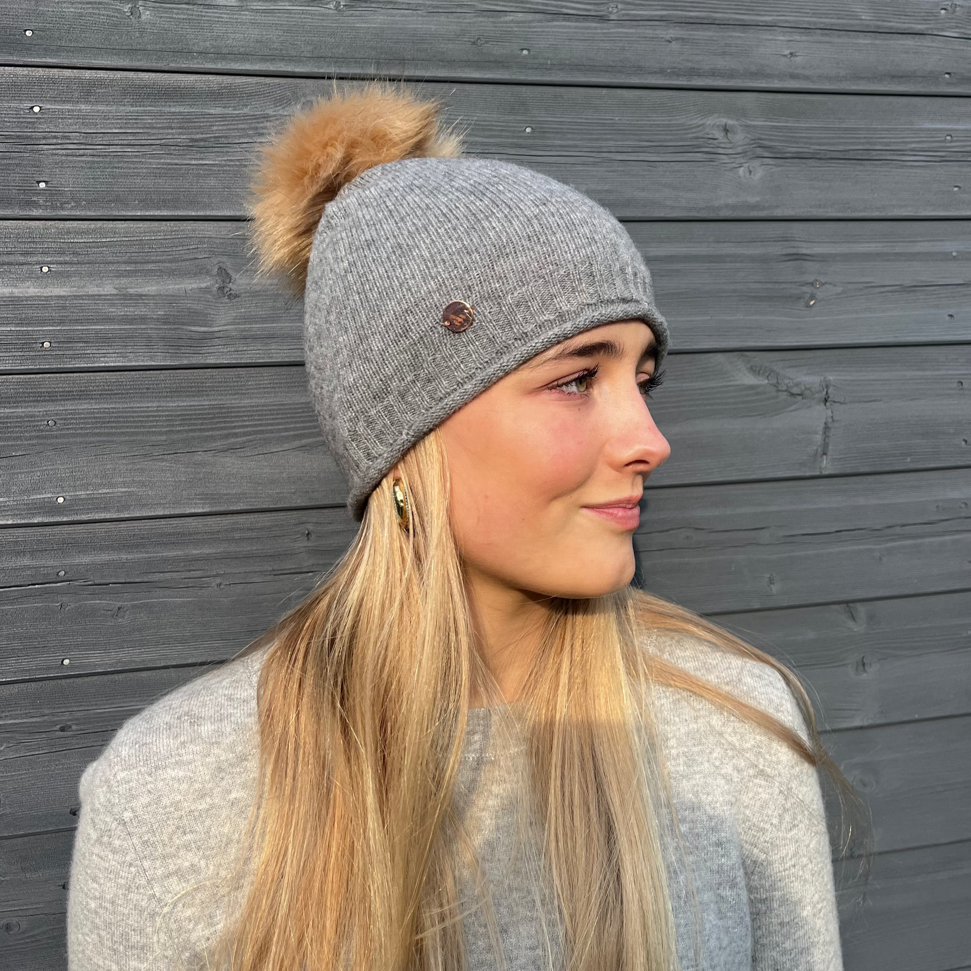 Grey cashmere plain knit beanie with faux fur pom